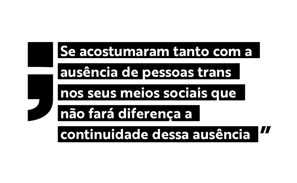 Mas encontro um coeficiente a respeito: o privilégio cisgênero de estarem formalizados em uma sociedade onde há papéis definidos para esses corpos e identidades normalizam suas condutas e sentem-se tão naturais que não percebem o “não natural”. Se acostumaram tanto com a ausência de pessoas trans nos seus meios sociais que não fará diferença a continuidade dessa ausência. Não sou obrigada a relatar para adultos os seus problemas de privilégio existencial. E vai ter gente que vai indicar que foi grosseria eu ter escrito esse texto. Mas perdão a vocês, sou eu quem decido o que foi tantas grosserias perpassadas nesse meio.