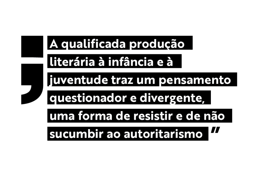 Bem sabemos que o futuro não é animador e que as infâncias e as juventudes correm perigo (o que é um sintoma da barbárie que nos assombra). Por isso, talvez mais do que nunca, é preciso fortalecer os vínculos entre todos os segmentos da cadeia do livro, a fim de que possamos continuar oferecendo uma literatura para crianças e jovens (futuros adultos leitores, é bom lembrar) que considere a diversidade de modos de ser, de estar e de intervir em sua própria história. A qualificada produção literária à infância e à juventude – assim como toda a boa literatura – traz um pensamento questionador e divergente, uma forma de resistir e de não sucumbir ao autoritarismo. Não é possível aceitar a redução dessa produção a uma mera decoração ou utilitarismo, recheada de clichês e estereótipos sobre a infância e a juventude, como já temos visto recentemente (mais informações neste link).