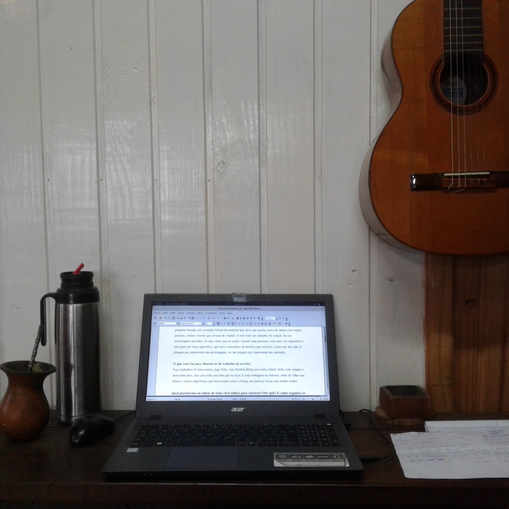 Faço trabalhos de marcenaria, vejo futebol, bebo com amigos e desconhecidos, namoro. E vejo bobagem na internet. Mas, na realidade, como escrever não paga minhas contas, é a literatura que funciona pra mim como uma distração do mundo burocrático.