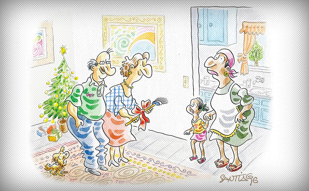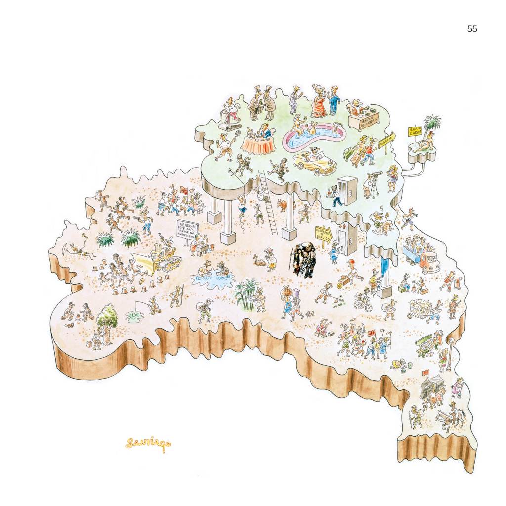 Desdenhando a pompa e a circunstância, com irreverência nata, Santiago é um artista conectado às questões sociais e sempre alerta contra as injustiças e as artimanhas de intimidação por parte dos poderosos. Afinal, se o rei está nu, alguém precisa registrar com qualidade e excelência. O cartunista reitera sua concepção sobre humor gráfico: “Humor é desdenho. Eu desdenho com muito empenho: da hipocrisia e sua miopia, do cinismo sem abismo, das convenções da sociedade com maldade, do preconceito sem respeito e do ódio de qualquer jeito”.