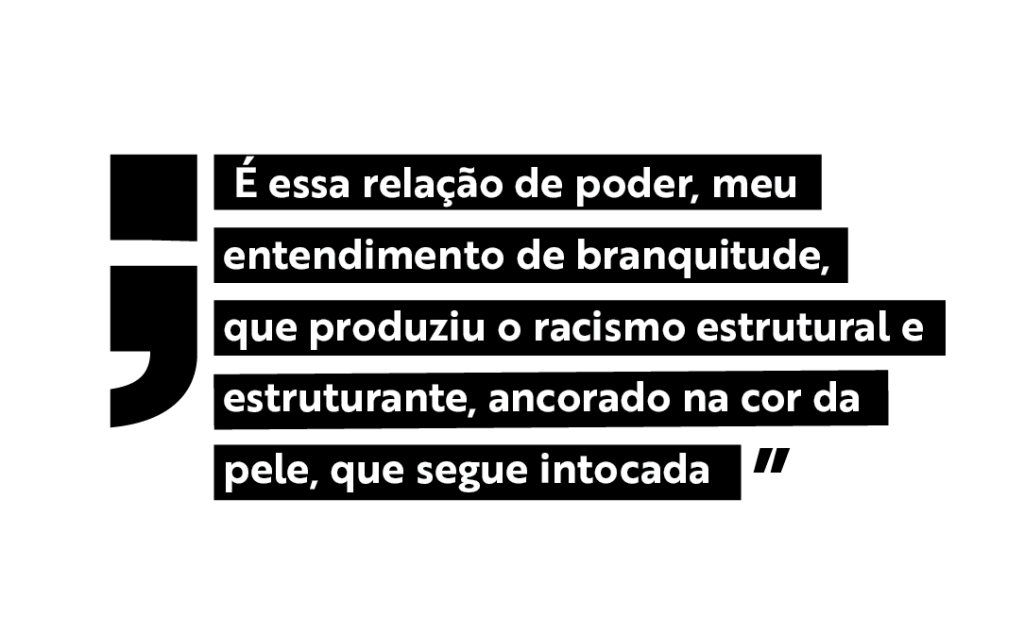 A origem da superstição estaria na simbolização do bem e mal pelas cores branco e preto, respectivamente. Defende que essa lógica teria sido transferida para a relação entre os grupos humanos. A ingenuidade da proposição destoa de sua genialidade, pois, a priori, desconsidera todas as relações escravistas e mesmo as teorias racistas vigentes no período que propunham uma verdadeira ontologia do humano excludente. É essa relação de poder, meu entendimento de branquitude, que produziu o racismo estrutural e estruturante, ancorado na cor da pele, que segue intocada.
