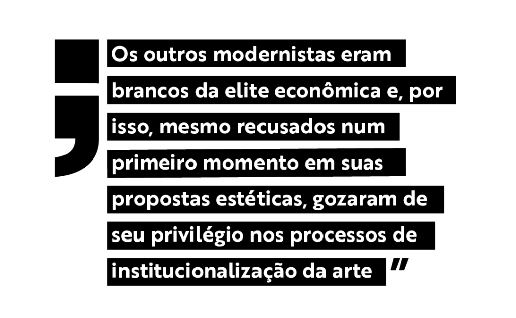 Quanto a semana de 22 e a experiência de Mário no período, fica como sugestão para estudos o quanto a “injúria” negro foi proferida contra ele, Mário, considerando que todos os expoentes do movimento foram xingados durante o evento e nos meses que o seguiram. No entanto, os outros modernistas eram brancos da elite econômica e, por isso, mesmo recusados num primeiro momento em suas propostas estéticas, gozaram de seu privilégio nos processos de institucionalização da arte, da referenciação histórica e na visibilidade de obras, produzidas na permanente ponte aérea São Paulo – Paris.