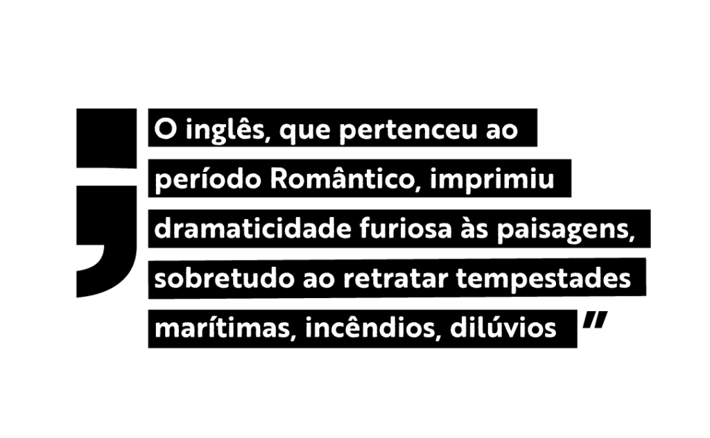 Após este episódio, fui atrás das obras do artista, que me provocaram — e ainda provocam — algo muito próximo à tontura. Um susto, uma confusão, um assombro, falta de ar. É o chamado sublime, não é? O inglês, que pertenceu ao período Romântico, imprimiu dramaticidade furiosa às paisagens, sobretudo ao retratar tempestades marítimas, incêndios, dilúvios. É quase inevitável se envolver no caos instaurado pelas suas tintas, um redemoinho de pinceladas pensadas em suspender a respiração de qualquer observadora de suas telas.