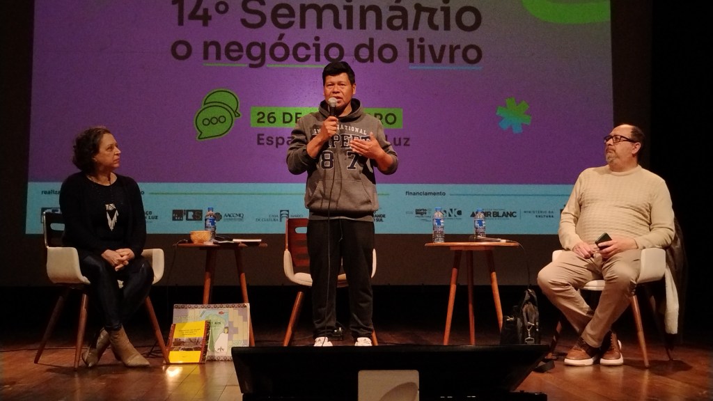 Após um breve intervalo, a mesa Arandu Mirim: Saberes Guarani Mbya Pra Cuidar do Mundo reuniu no palco o editor Pablo Morenno, a pesquisadora Ana Tettamanzy e o professor e escritor Gerônimo Franco — apelido ocidentalizado de Verá Tupã. A atividade jogou luzes sobre a intersecção entre a tradição escritocêntrica e aspectos da cultura narrativa oralizada dos Guarani Mbya, povo cujo território abrange cinco países da América do Sul.