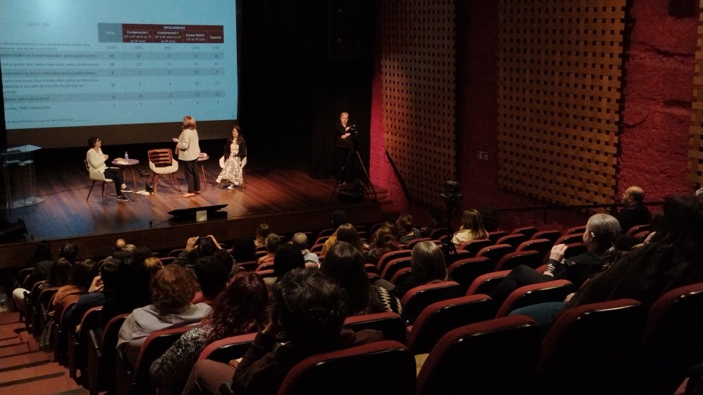 Em seguida, iniciou a atividade Da “Retratos da Leitura” à Mediação: Caminhos Possíveis para Uma Nação Leitora. Subiram ao palco a gerente de pesquisas do Instituto Pró-Livro (IPL) Zoara Failla, a professora e pesquisadora Franciele Vanzella e, como mediadora da atividade, a editora Annete Baldi. A conversa começou com a apresentação dos resultados da pesquisa Retratos da Leitura 2024, que, em caráter quadrienal e pela sexta edição, oferece a mais ampla radiografia da leitura no Brasil. Segundo Zoara, a pesquisa identificou a potência editorial dos livros religiosos — preferência de leitura inclusive entre professores —, seguido dos títulos infanto-juvenis de autores internacionais e, por fim, auto-ajuda. A pesquisa também indicou uma perda de mais de 11 milhões de leitores desde 2015, fazendo com que 53% dos entrevistados se identificassem como não-leitores. O Centro-Oeste foi a única região que não teve queda nos índices de leitura; quesito em que São Paulo e Minas Gerais foram alguns dos destaques negativos. Todas as edições da pesquisa seguem disponíveis aqui.