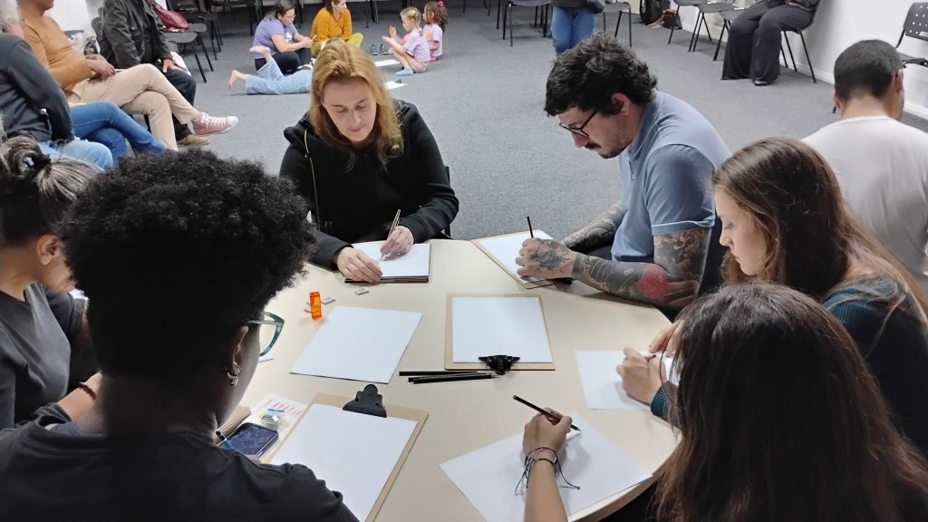 Após o almoço, a editora Fernanda Scherer recebeu o ilustrador Odilon Moraes no painel Uma Breve História do Livro Ilustrado. Na atividade, o artista e pesquisador revelou a falta de consenso no Brasil e no exterior sobre as definições do que é livro ilustrado, livro de imagem, arte sequencial ou picture book. Seu argumento foi corroborado pela leitura compartilhada ao vivo de Esse chapéu não é meu, de Jon Klassen, em que as ilustrações convidam o leitor a amarrar as contradições da narrativa. “As imagens são fragmentos de uma história”, explicou.